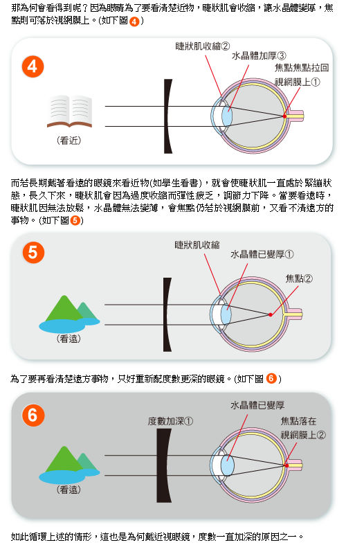 平時我們眼睛不會只看遠處,尤其是現代社會,我們看電腦電視的時間很多,這時遠處物體向眼睛靠近,就要靠眼睛的睫狀肌,將影像重新拉回到視網膜上,這種睫狀肌收縮的能力,就稱「調節力」(圖二)。